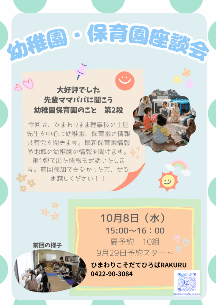 9月に好評でした『先輩ママパパに聞こう!幼稚園のこと保育園のこと』で出た情報をまとめた座談会を開催いたします。