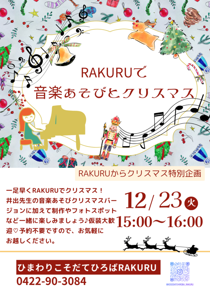 ホームお知らせ RAKURUで音楽あそびとクリスマス 2025年12月15日 SHARE ポスト シェア はてブ LINE 音楽あそびの井出先生と一緒に、親子で楽しむクリスマス。スタッフによる制作あそびもあります。 仮装も大歓迎!フォトスポットも用意しています。ちょっとしたクリスマス気分で、気軽に遊びに来てください。 ご参加をお待ちしております♪