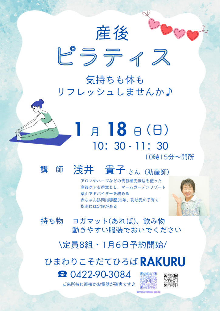 助産師の浅井先生をお招きして産後ピラティスを教えていただきます。