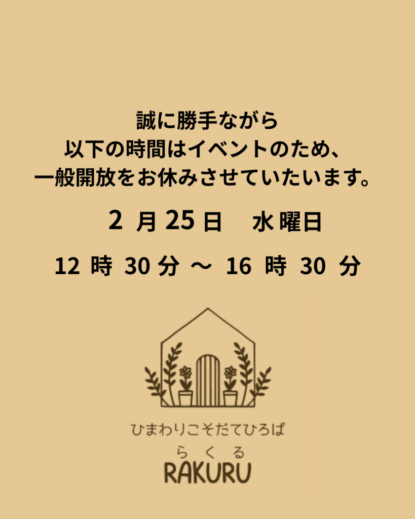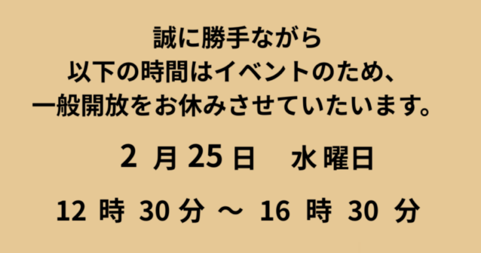 ホームお知らせ 【お知らせ】2月25日(水)について 2026年2月24日 SHARE ポスト シェア はてブ LINE 明日は、イベントがあるため12時30分から一般開放お休みさせていただきます。 みなさまにはご不便をおかけしますが、ご理解とご協力をお願い申し上げます。