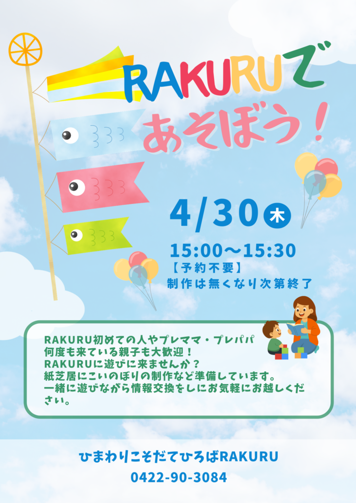 ホームお知らせ RAKURUであそぼう! 2026年4月21日 SHARE ポスト シェア はてブ LINE RAKURUで楽しみませんか? 今回は、初めての方やプレママ・プレパパ大歓迎!何度も遊びに来ている親子もお気軽にお越しください。 予約は不要ですが、制作は無くなり次第終了となります。